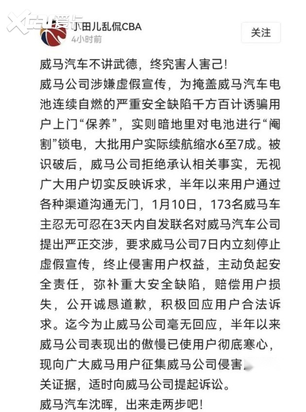 此前威马EX5 车主爆料,威马汽车借助活动对车主的车辆进行锁电,使得车辆的续航里程大大缩减。面对用户的质疑、投诉以及媒体的屡次曝光,威马汽车迟迟未正面回应引发车主们众怒,173名车主于近日联名向威马汽车厂家发送律师函维权。