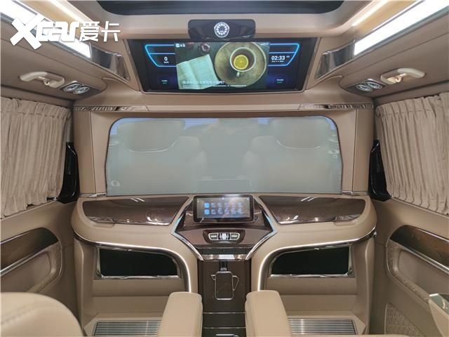 前后舱采用全隔断设计,由顶部无线吸顶电视机,雾化升降的玻璃,以及下方的吧台三部分组成。不仅可以保证前后舱相对独立性,保证后舱的私密性;其次想要与驾驶舱交流对话,也可以升降雾化玻璃。多功能吧台高级皮革包覆,热水壶,两边是柏林之声音响,配合隔断处的大电视,看电视刷综艺,其乐无穷。