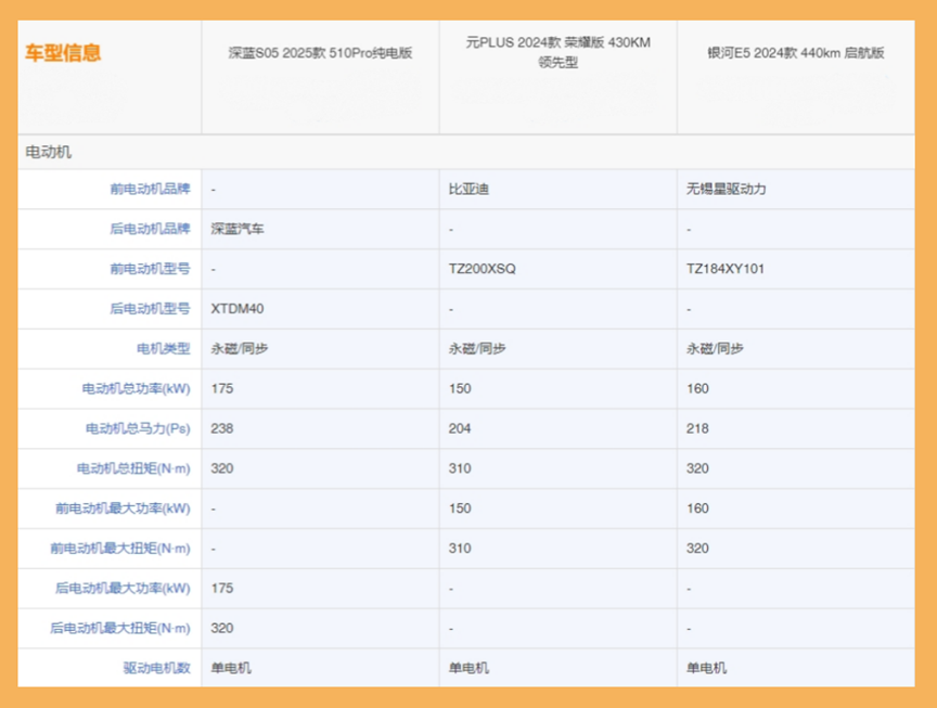 来看看三台车的动力及续航表现。动力层面,深蓝S05配备了一台后置驱动电机,最大功率175kW。元PLUS配备了一台前置驱动电机,最大功率150kW。吉利银河E5搭载银河11合1智能电驱,最大功率160kW。