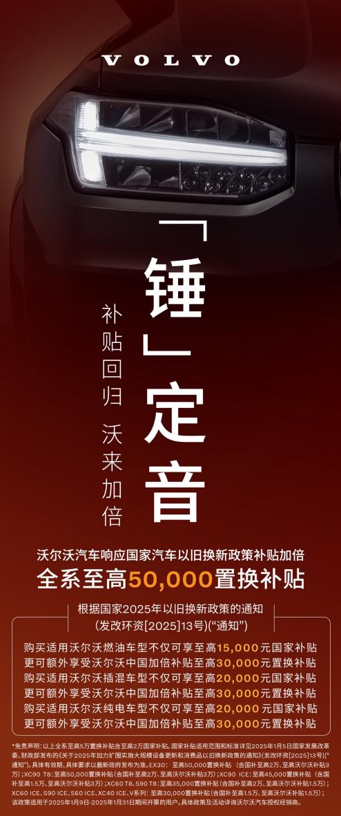 根据国家2025年以旧换新政策的通知(发改环资[2025]13号)(“通知”),购买沃尔沃燃油车型不仅可享至高15,000元国家补贴,更可额外享受沃尔沃汽车加倍补贴至高30,000元置换补贴;购买沃尔沃插混车型或纯电车型不仅可享至高20,000元国家补贴,更可额外享受沃尔沃汽车加倍补贴至高30,000元置换补贴。