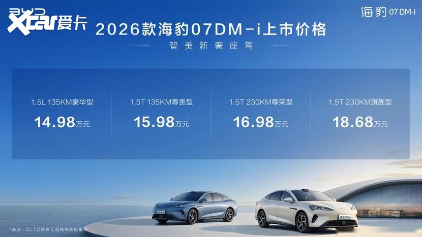 9月15日,智美新奢座驾——2026款海豹07DM-i正式上市,新车共推出4个配置版本,官方指导价格为14.98万元-18.68万元,并推出越享钜惠礼、越享置换礼等六重购车礼遇。2026款海豹07DM-i在“智能、舒适、性能、颜值、安全”五大维度全面进阶,基于全新一代插混整车平台打造,新增云辇-C 智能阻尼车身控制系统、TSC高速爆胎稳定控制系统及天神之眼 B - 辅助驾驶激光版(DiPilot 300)等硬核黑科技,为用户带来高品质出行新体验。