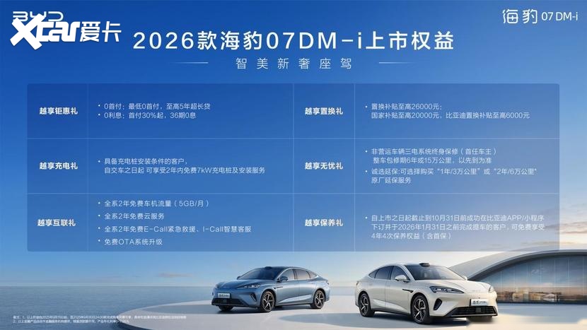 2026款海豹07DM-i以多维产品力进阶,精准满足用户对中大型轿车高品质出行的核心需求。并凭借不断升级的第五代DM技术、领先同级的辅助驾驶以及超百项全系标配等越级配置,将豪华车型的高端配置全面下探至主流市场,以“技术平权”重塑中大型轿车市场价值标准,刷新中大型轿车同级价值标杆,引领出行新体验。目前,新车已全面到店,欢迎感兴趣的用户通过比亚迪APP了解详情或到比亚迪海洋网各大门店品鉴试驾。