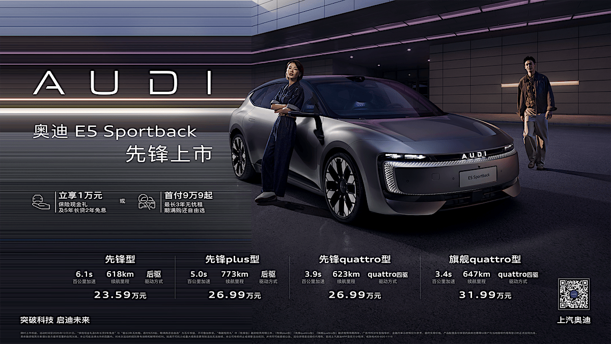 9月16日上市的奥迪E5 Sportback就是最好的答案。新车共推出4款配置,售价区间23.59万-31.99万元。