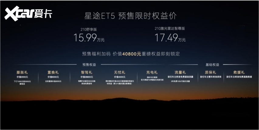 而此次星途 ET5 的预售登场,就像一颗投入 15-20 万级市场的「深水炸弹」。它用 50 万级的配置(8255 芯片、1310公里的综合续航、激光雷达智驾等配置)以及15 万级的价格,精准打消了当下无数消费者的购车纠结,更撕开了 「豪华 = 高价」 的伪命题。 它让用户明白,真正的豪华从来都不是价格的堆砌,而是对用户需求的极致满足。现在「万事俱备,只欠正式价格」。相信星途ET5正式上市时,在价格上还会为消费者带来足够的惊喜,让我们共同期待它的到来吧!