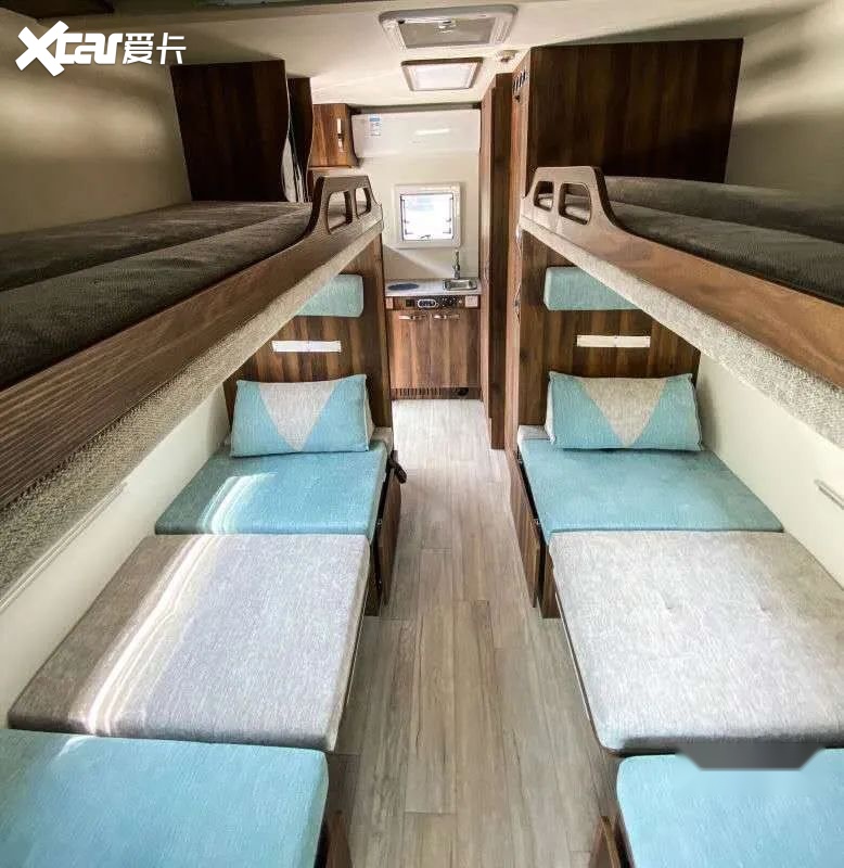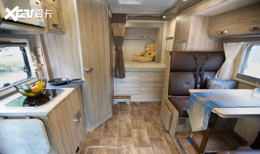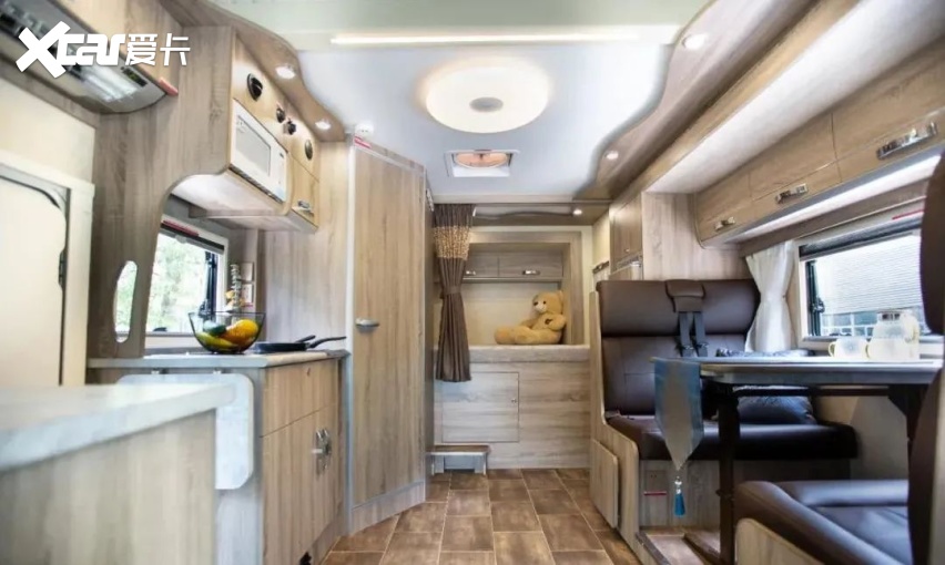 房车内部的整体布局是额头床/组合柜、对坐卡座、厨房区、卫生间和尾部睡卧区。车内影音娱乐系统是顶级的:丹拿音响+富生功效+JBL低音炮。额头床部分都有做软包处理,对立式车窗+床帘+翻转式32寸高清液晶电视的配置经典,后方的储物立柜能存放零碎的物品。