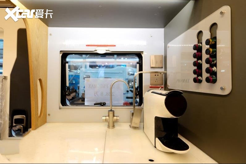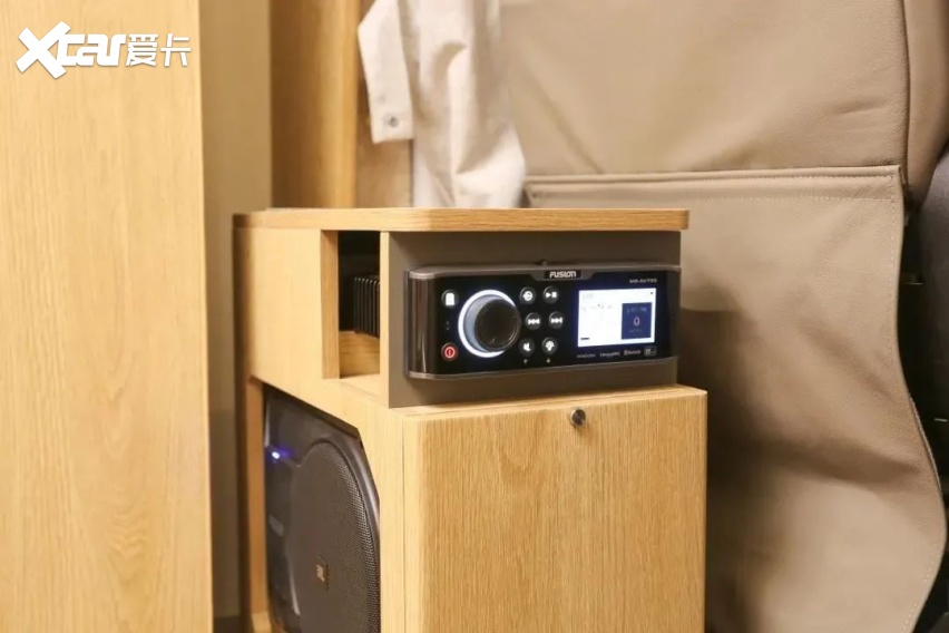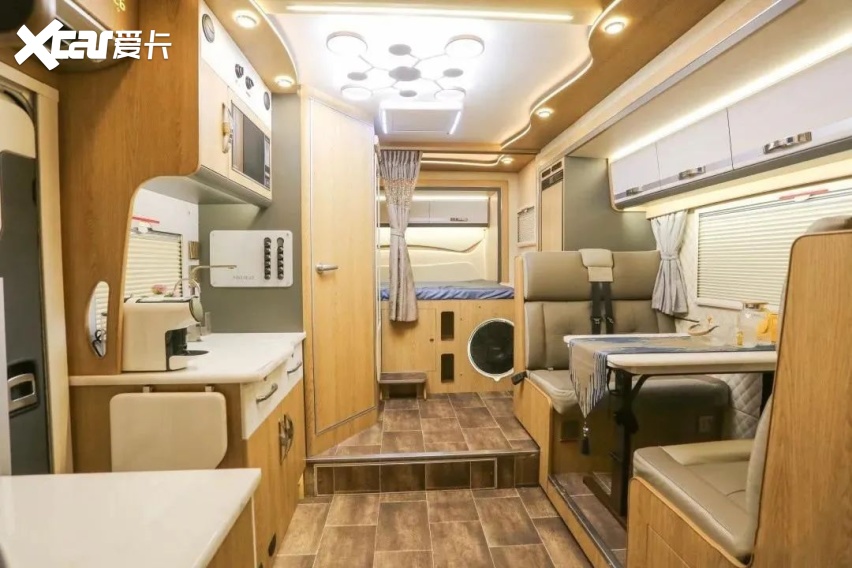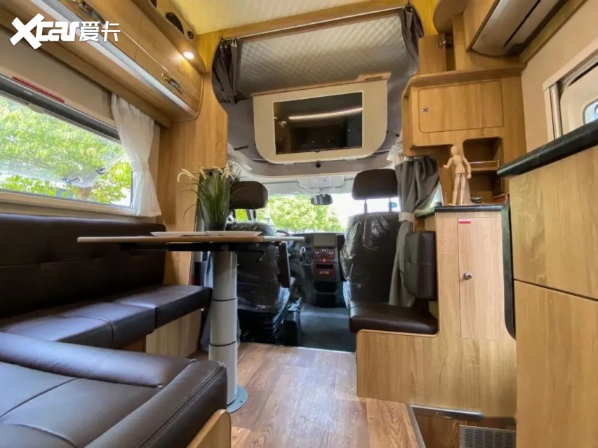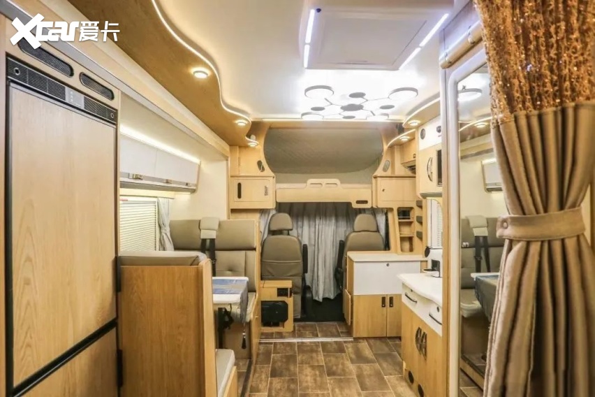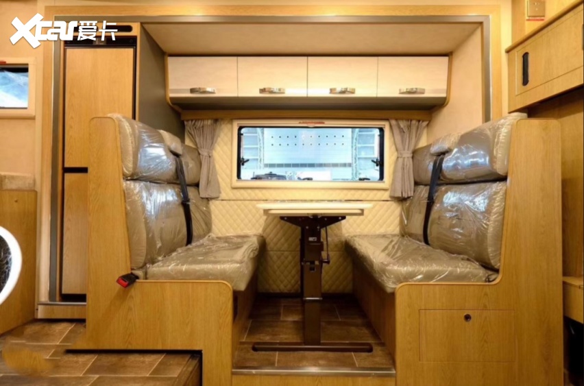 卡座区是真皮包裹的沙发,中间的餐桌带拓展,并可前后左右调节;152L的进口双开门车载冰箱位于座椅后方,冷藏冷冻均可。