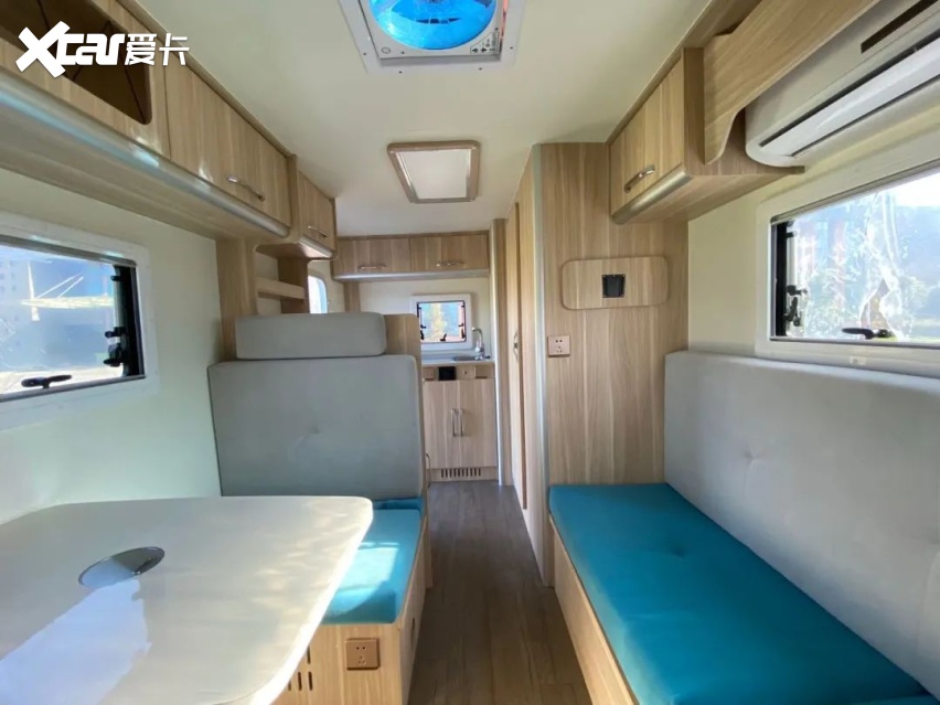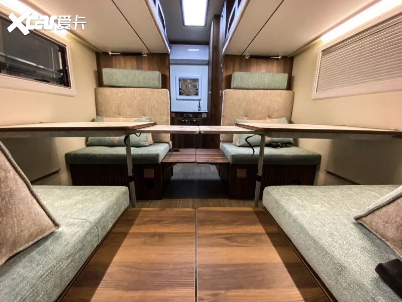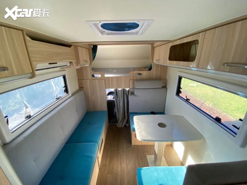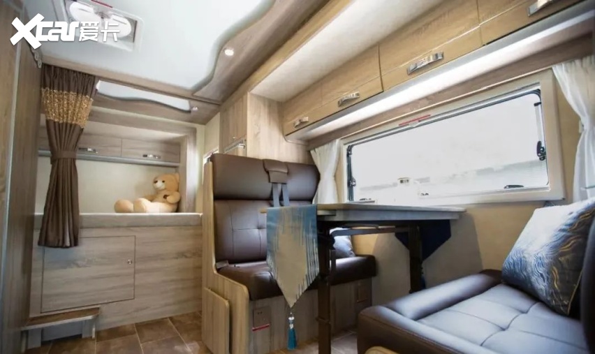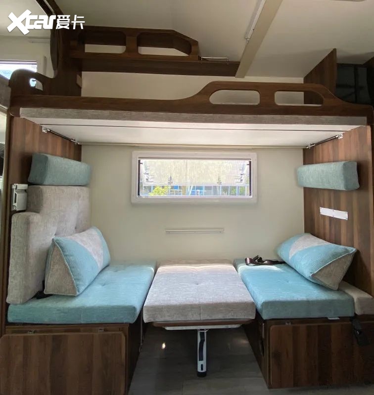 会客区空间也相对比较宽敞,双人对坐式卡座搭配升降餐桌的设计,可满足四人乘坐。卡座上方是储物柜,可方便存取日常生活用品。超大观景车窗配上拉帘,观景休憩两不误。驻车后,将餐桌降下还可与卡座拼成一张尺寸为1870*940mm的沙发床,以供休息。