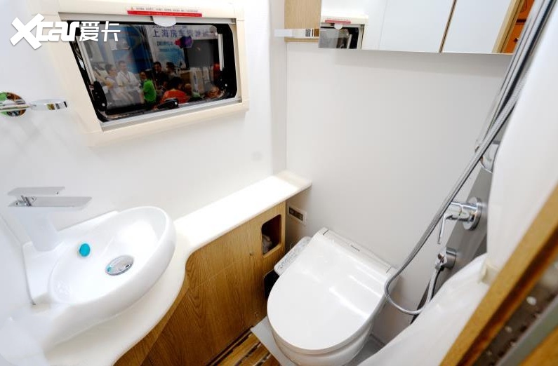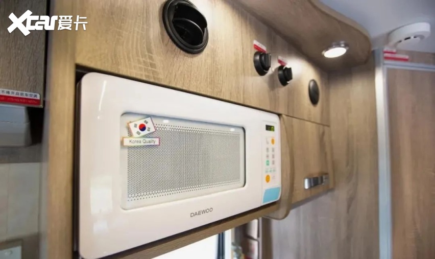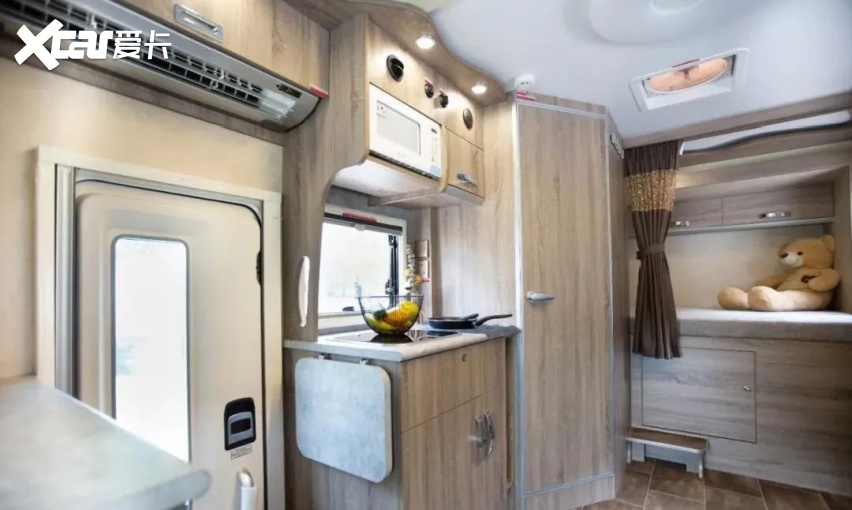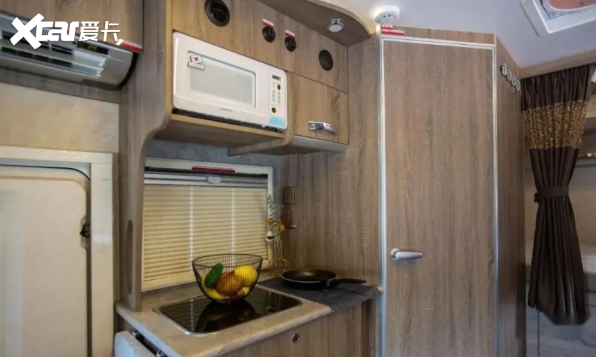 厨房区配置也很齐全,配有翻盖式水槽、水龙头、微波炉、储物柜、外推窗、电源插座 、小米电磁炉、152L专用冰箱等,同时房车还配有户外厨房,室内室外烹饪随意切换。
