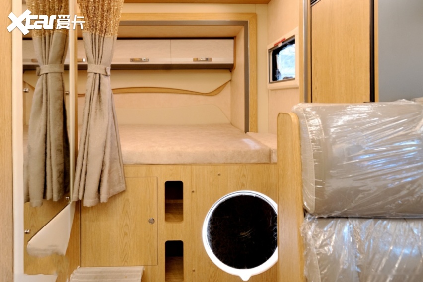 外观上是大额头设计,对应的驾驶室上方是额头双人床。床铺尺寸为1900*1200mm,基本可以满足两名成年人的休息。床铺周边配有窗户、拉帘等,保证采光的同时也保护个人隐私。