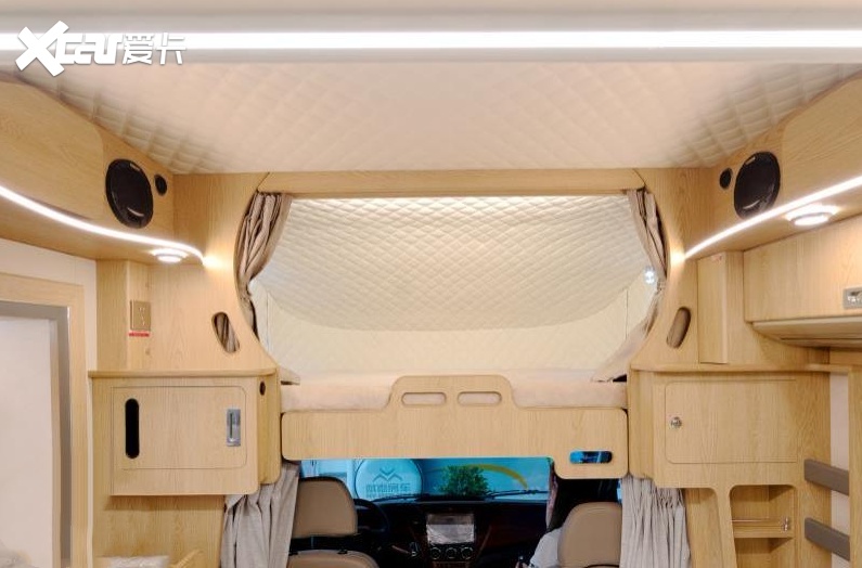 驾驶室上方是一张额头大床,尺寸为2210*1500mm,内嵌32 英寸小米智能电视。