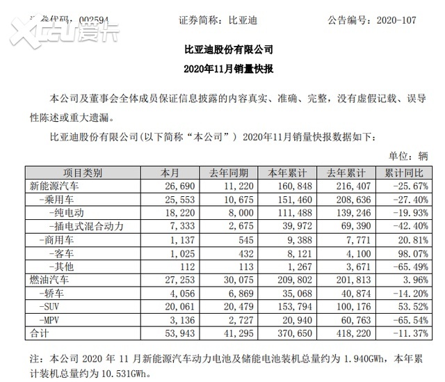 数据显示,比亚迪11月份共售出53943辆车,其中乘用车板块共售出52806辆,新能源车占26690辆,同比增长138%;燃油车占27253辆,同比小幅度下滑。前11月份,比亚迪累计售出370650辆新车,同比下降11.37%,幅度相比上月有明显收窄。
