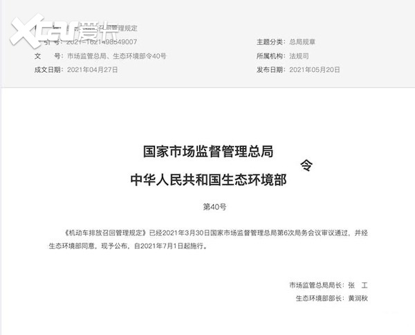 日前,国家市场监督管理总局和生态环境部联合发布的《机动车排放召回管理规定》7月1日起将施行。