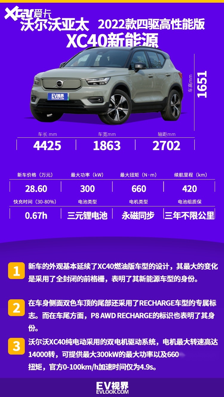 【EV视界原创试驾】作为沃尔沃的首款纯电动车型,XC40 RECHARGE于2020广州车展上正式上市。新车在当时只推出了一款车型,官方售价为35.70万元。在刚刚过去的2月份,新车又推出了两款单电机版本车型,售价分别为25.70万元和27.60万元,进一步拉低了入手门槛。此次,我们又拿到了2022款的双电机版车型,接下来就跟我们一起去试一试它!