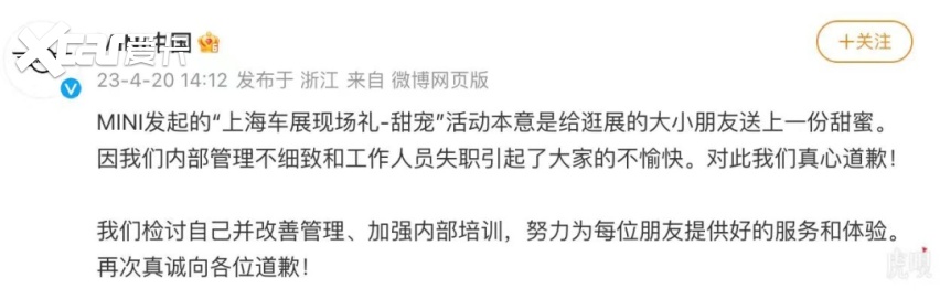 随后,MINI中国回应称,活动本意是给逛展的大小朋友送上一份甜蜜,因内部管理不细致和工作人员失职引起了大家的不愉快,对此真心道歉!