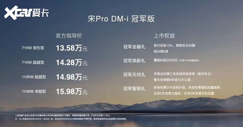 在新车上市权益方面,官方提供冠军焕新礼(置换补贴2500元(不含71KM领先型));冠军无忧礼(非营运车辆三电系统终身保修 (首任车主)整车包修期6年或15万公里);冠军智联礼(终身免费OTA系统升级,终身免费基础流量服务 全系2年免费云服务,全系2年免费车机流量)等。