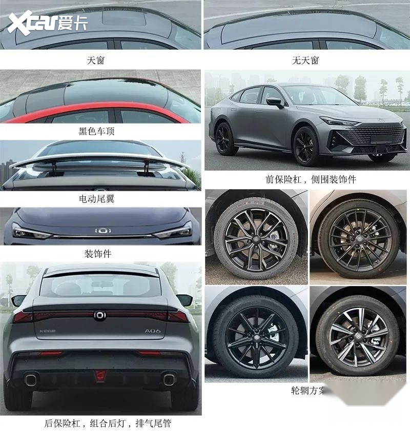 启源A06也保留了UNI-V的电动尾翼设计,同时无天窗、小天窗和全景不可开启天窗的版本都有,轮毂也有四种选择。