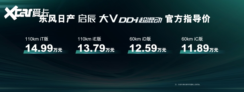 新车共推出了4个版本,其中,启辰大V DD-i超混动60km iC版官方指导价11.89万元,60km iD版官方指导价12.59万元,110km iE版官方指导价13.79万元,110km iT版官方指导价14.99万元。