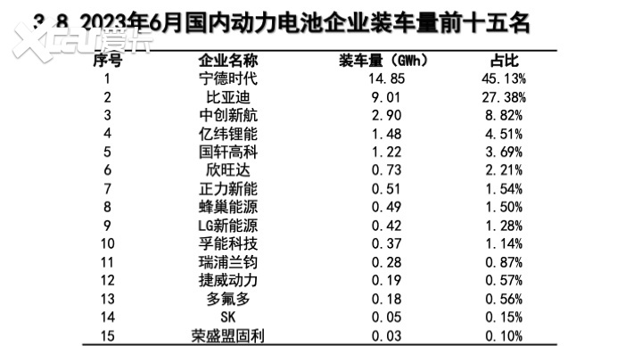 6月,宁德时代动力电池装车量为14.85GWh,排名第一,市占率为45.13%;比亚迪动力电池装车量为9.01GWh,排名第二,市占率为27.38%。