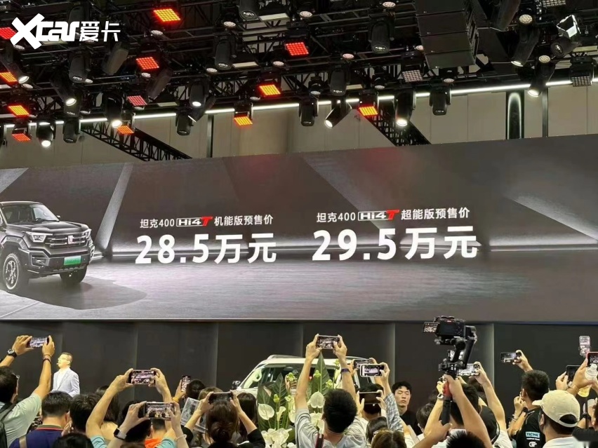 8月25日,买车网Buycar成都车展前方报道团传来消息,坦克400 Hi4-T开启预售,推出机能版和超能版两款车型,预售价为28.5万-29.5万元。新车定位于中大型越野SUV,整体看上去颇为硬朗,涉水深度为800毫米,搭载2.0T发动机,并具备超级50kW快充,从30%-80%仅需24分钟。