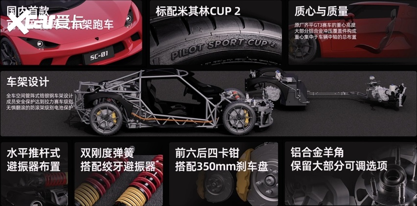 车身侧面,短前后悬的设计使得整车看起来更加紧凑和动感。18英寸轮圈造型酷炫,配备的米其林Pilot Sport CUP2轮胎更是赛道上的常客,其245/40 ZR18的轮胎尺寸和前6后4的刹车卡钳配置,无不显示出SC01对于性能的极致追求。车身尺寸方面,新车长宽高分别为4105/1830/1160mm,轴距为2500mm,这样的尺寸既保证了驾驶的灵活性,也兼顾了内部空间的舒适性。