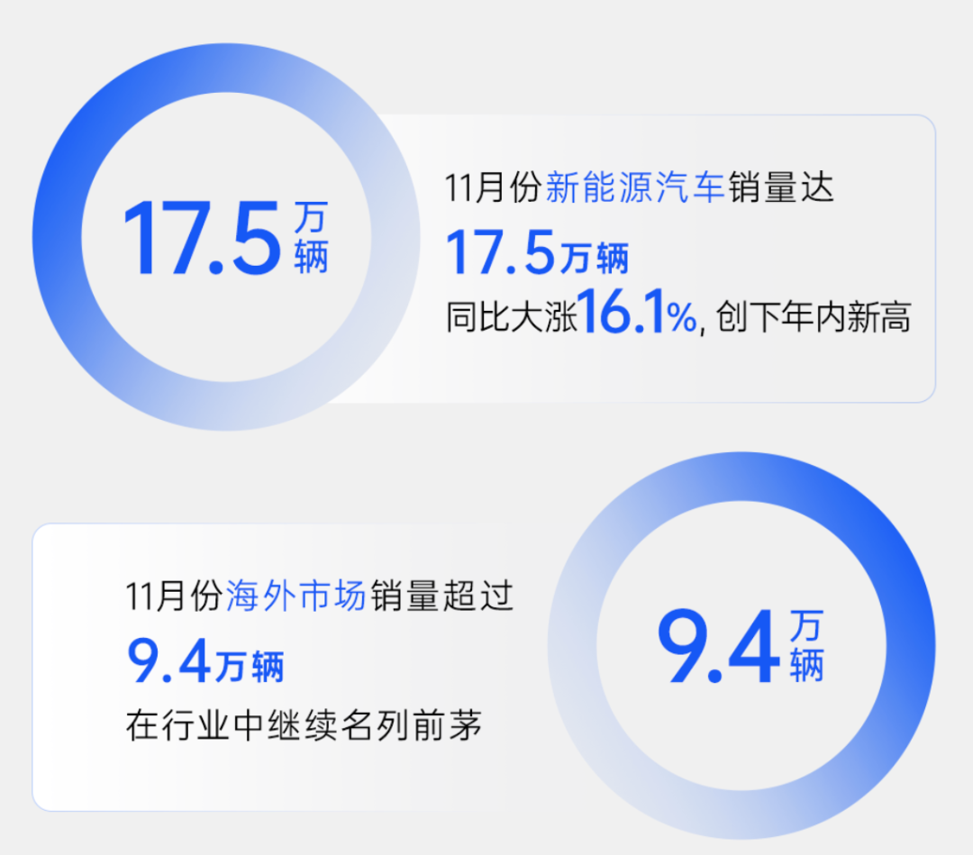 其中,新能源车11月销量为17.49万辆,同比增长16.06%,前11个月销量108万辆,同比增长19.53%;出口及海外基地销量上,其11月销量为9.42万辆,同比下滑20.05%,前11个月累计销量为93.75万辆,同比下滑12.13%。