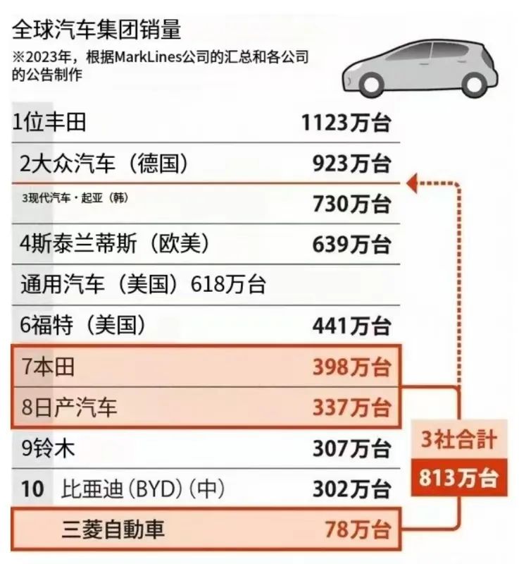 倘若顺利,不到两年后,我们将看到一个“小丰田”出现。以2023年销量作为计算基础,本田全球销量398万辆,日产337万辆,三菱78万辆;合计813万辆,仅次于丰田(1,123万辆)和大众(923万辆),超过现代(730万辆)。