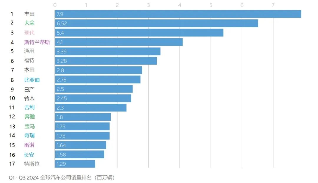 2024年前三季度,虽然丰田大众现代斯特兰蒂斯通用仍然稳稳把持全球销量前五强,但比亚迪已经杀到第8名,吉利距离第10名仅一步之遥,奇瑞也排到第14名,长安距离15名雷诺差距甚微。