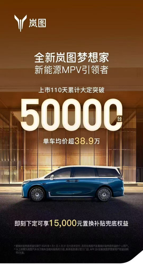 作为自主品牌的重要代表,岚图汽车在市场上有着不错的销量和口碑。特别是全新岚图梦想家,凭借其豪华舒适的空间、先进的智能科技以及出色的动力性能,上市即爆款,位居高端新能源MPV销量第一,去年12月实现单品过万,上市110天累计大定突破50000台,成为新能源MPV引领者。