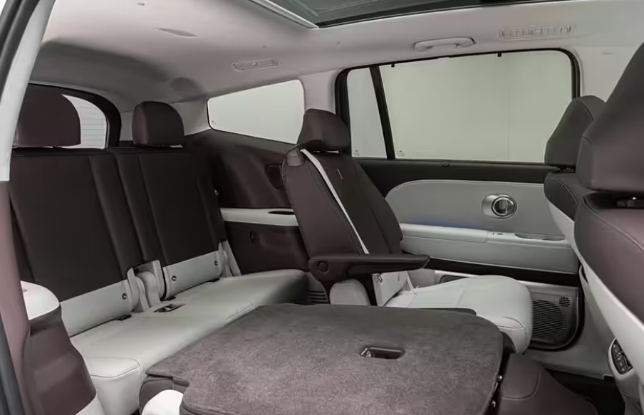 从外观来看,IONIQ 9 采用了现代品牌独特的设计理念。前脸部分神似全新胜达,上方贯穿式灯带搭配点阵式光源,极具辨识度;下方纵向灯珠式远近光灯呈双竖杠排列,科技感十足。前保险杠处的银色护板与主动式进气格栅,既提升了空气动力学效果,又增添了几分硬朗气质。车身侧面,流线式设计十分吸睛,超长车身与极短车头尽显纯电动平台特征。上扬的侧面窗线在 D 柱处由特殊镀铬条衔接,隐藏式电动门把手不仅美观,还降低了风阻,助力整车风阻系数低至 0.259Cd 。车尾设计与车头呼应,纵向尾灯未点亮时呈白色,点亮后呈现简洁 T 字形红色光源,上方连续高位刹车灯全部亮起形成闭环,个性又美观 。