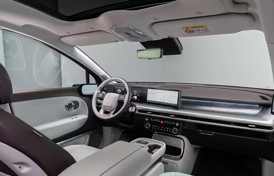 车内,IONIQ 9 以柔和的 “椭圆形” 设计元素为主调。两个 12.3 英寸双联悬浮式曲面屏与 HUD 抬头显示功能形成三屏联动,方便驾驶者获取信息。用料上,大量银色材料搭配白色与浅绿色皮质,营造出强烈的未来感。三辐式方向盘采用立体化双色皮质设计,握感舒适且富有立体感。值得一提的是,车内保留了大量实体按键,空调、驾驶模式、多媒体等操作均可通过按键完成,相比纯屏幕操作更加便捷 。