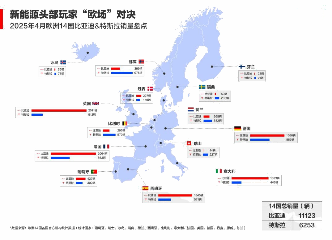 2025年4月,比亚迪在西班牙、意大利、法国、英国和德国等欧洲汽车核心市场,销量已经全面超越特斯拉;从欧洲14国整体看,比亚迪以11123辆的销量表现,大幅领先特斯拉的6253辆。