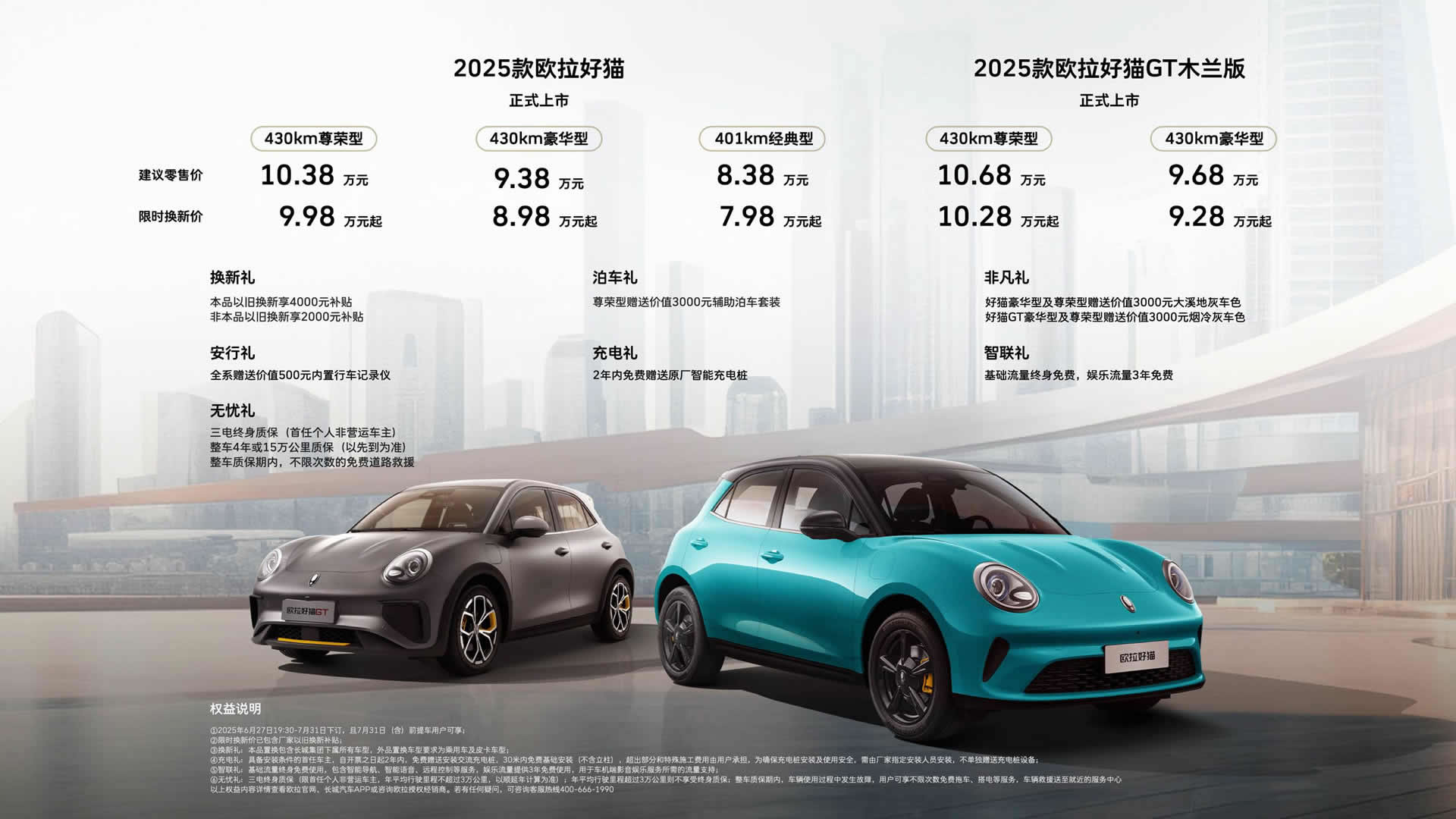 6 月 27 日,2025 款欧拉好猫及 GT 木兰版在保定长城汽车技术中心上市。2025 款欧拉好猫建议零售价 8.38 万~10.38 万元,限时换新价 7.98 万~9.98 万元;GT 木兰版建议零售价 9.68 万~10.68 万元,限时换新价 9.28 万~10.28 万元,下订用户可享 7 重限时好礼。新车以诚意价格、越级价值及经典时尚造型,重新定义精品 A0 级纯电轿车价值标杆。
