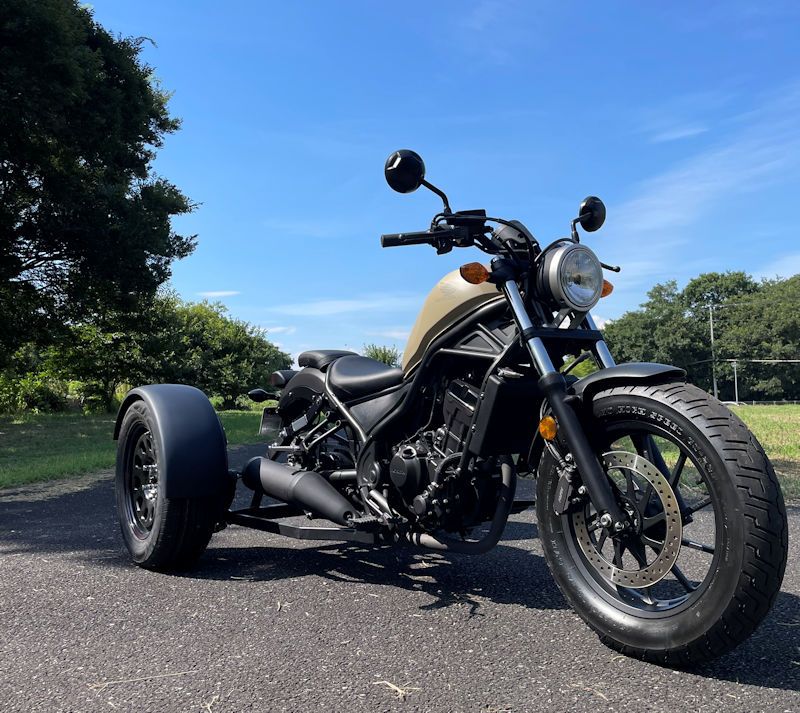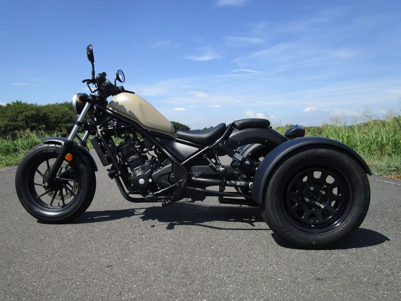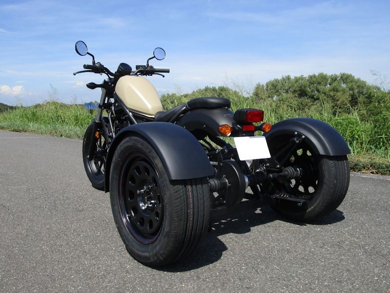 Sakuma Engineering 是日本专门从事 Trike 与 Sidecar 开发的改装品牌,已有近半世纪经验。 这台 Rebel 250 Trike 的后轴结构采用自家设计的差速器系统,并导入双后轮设定,让这台原本就颇具个性的街车多了更多视觉与机能层面的进化。 宽达1298mm的车体搭配15寸汽车胎规格后轮胎,不只气势提升,整体稳定性也明显加分。