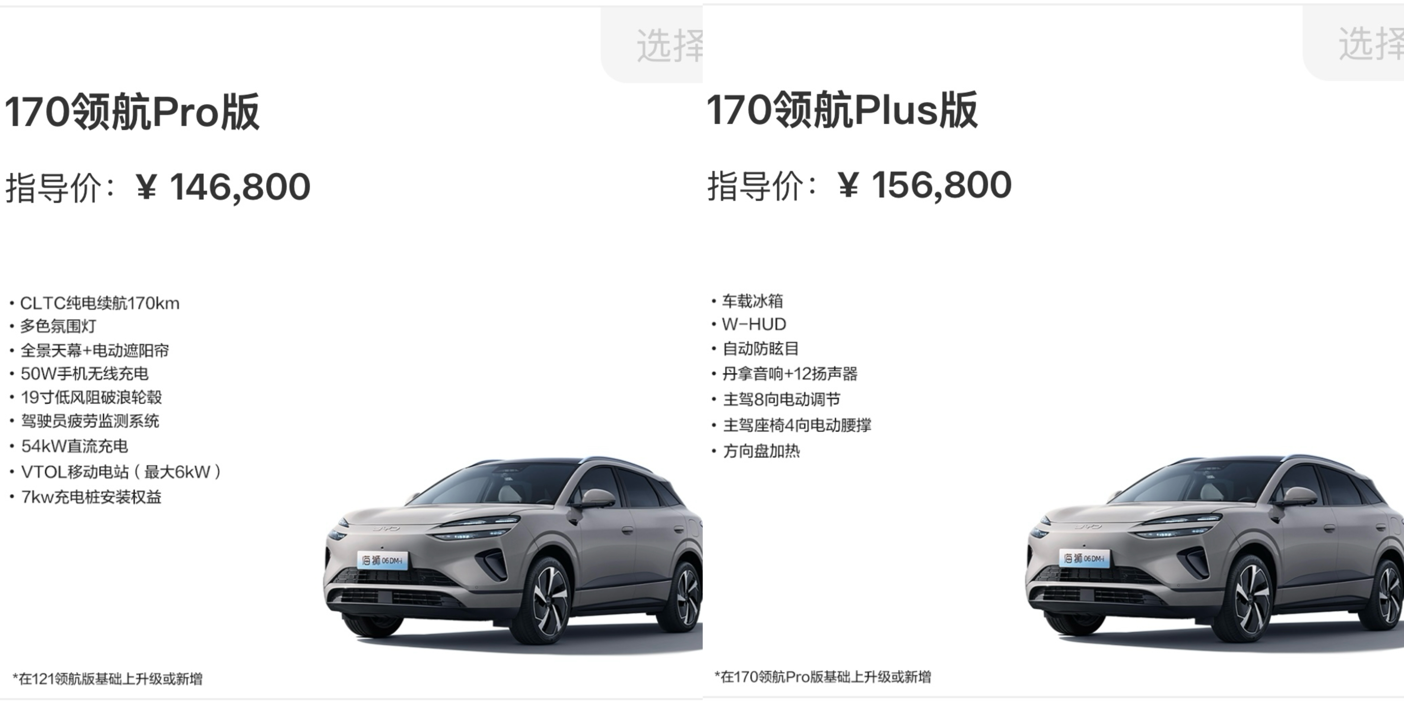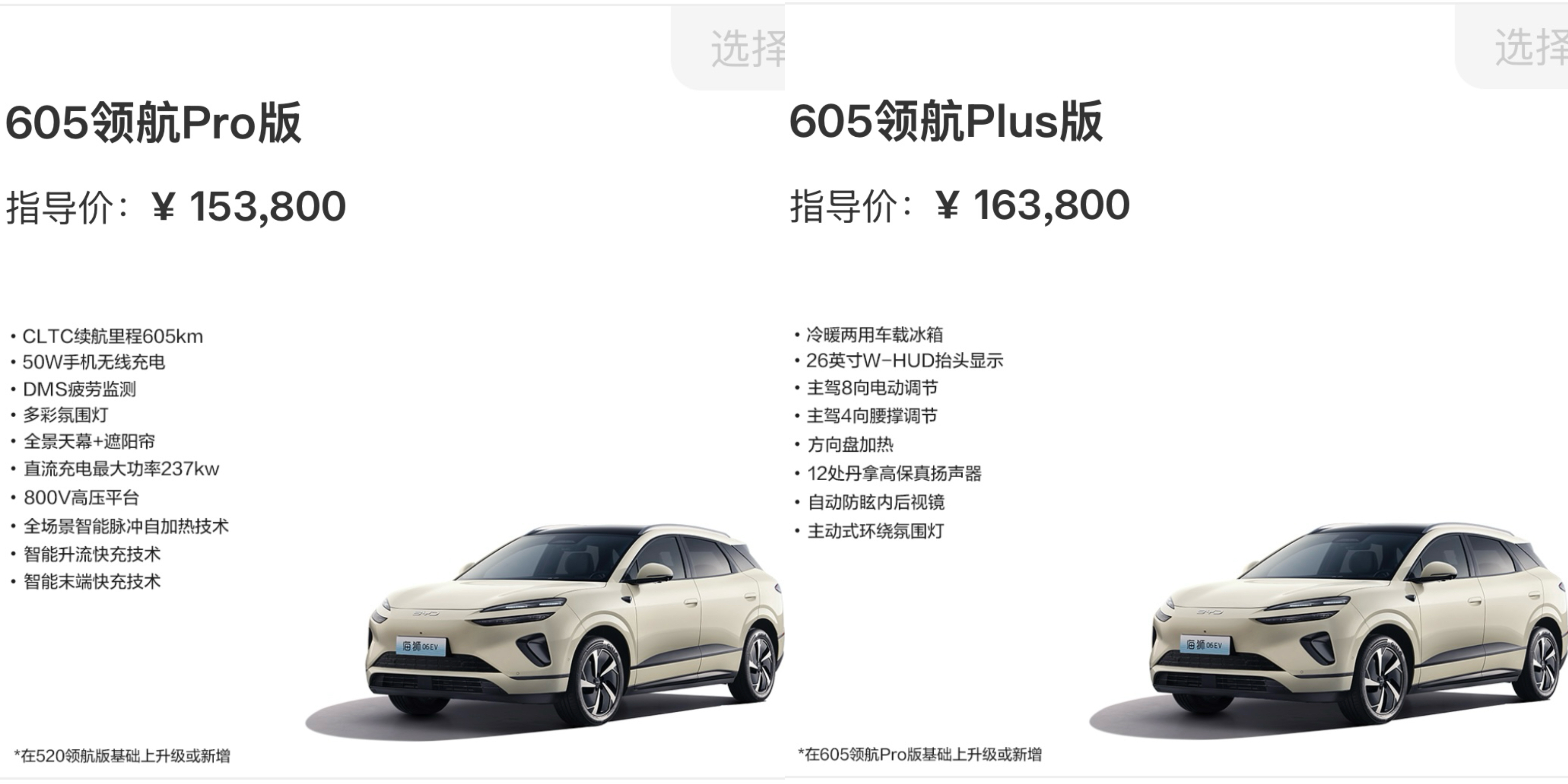 纯电车型的配置差异主要集中在续航和充电速度这两项,与混动车型不同,纯电车型的续航和充电速度差异带来的感知要更为明显。领航版车型的CLTC续航里程为520km,领航Pro版车型的续航里程为605km。别小看多出来的这85km续航,如果跑450km左右的长途,就存在中途补电与不补电的区别,长期用车下来效率上的差异十分明显。并且领航Pro版及以上还支持800V的快充,更长的续航和更快的充电两者相叠加,体验感进一步放大。
