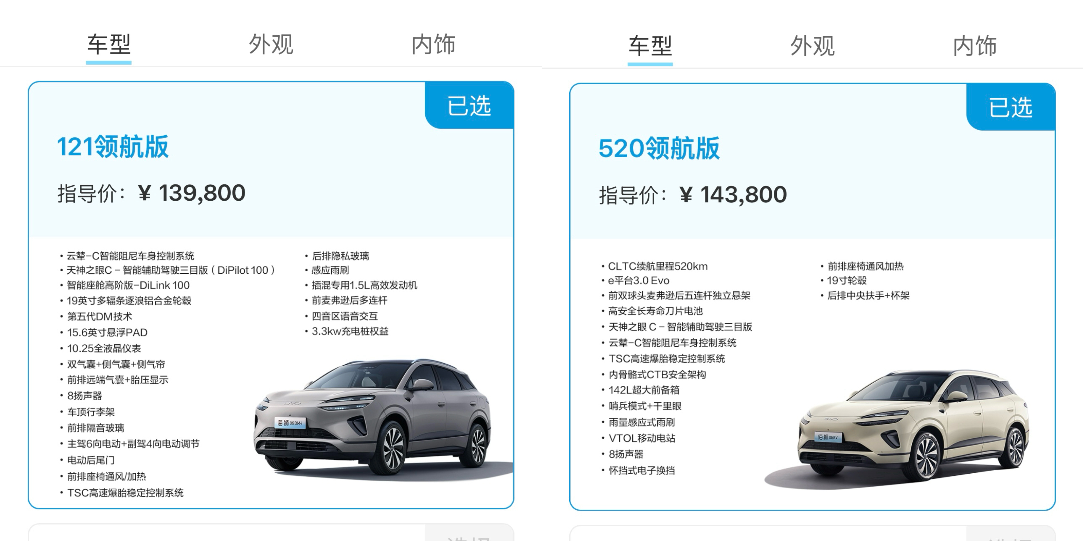 分为两种情况,如果是家庭唯一用车,那么更为推荐DM-i车型当中的领航Pro版,因为这个版本既不用考虑充电焦虑,续航里程也能够覆盖上下班通勤以及周末的短途出游需求。如果是家庭燃油车之外的补充用车,绝大多数场景为通勤以及中短途出游,可以更多的考虑纯电车型,并且续航为520km的领航版就足够了。