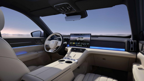 从官图能看到,新车内饰提供双色配色,采用环抱式布局,仪表和中控均为悬浮式设计,并且减少了实体按键,现代感十足。值得一提的是,悬浮式中控屏支持左右 10 度偏转,这样的设计很实用,主驾开车时,副驾帮忙操作设置或娱乐功能时,不会对驾驶者造成太大干扰,同时也方便副驾操作。