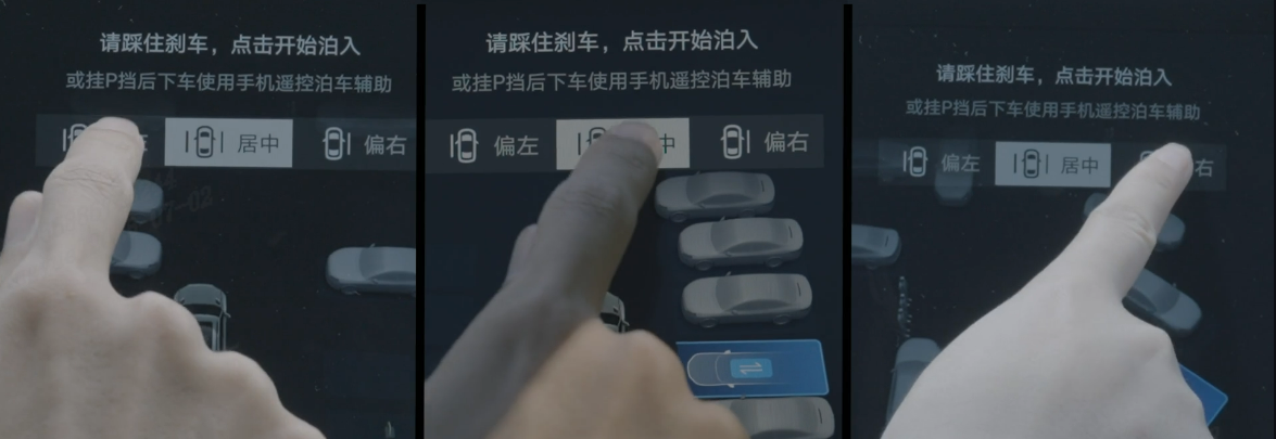 用户选择好可泊入的车位后,可以根据两侧车辆或其他障碍物的位置状态,手动选择车辆的偏置状态,可选择居中、偏左、偏右,从而与他车保持一定间隙,方便上下车的同时规避剐蹭等风险。
