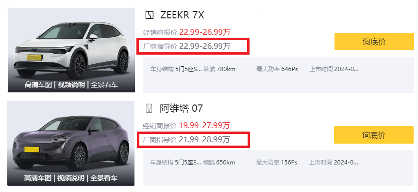首先说价格部分,定位为中型SUV的极氪7X有3个版本车型,全系均为纯电车型,厂商指导价为22.99-26.99万元,而阿维塔07的厂商指导价为21.99-28.99万元,提供了增程版和纯电版车型供我们消费者去选择。可以看出这两款车型不仅定位相同,而售价区间更是高度重合。