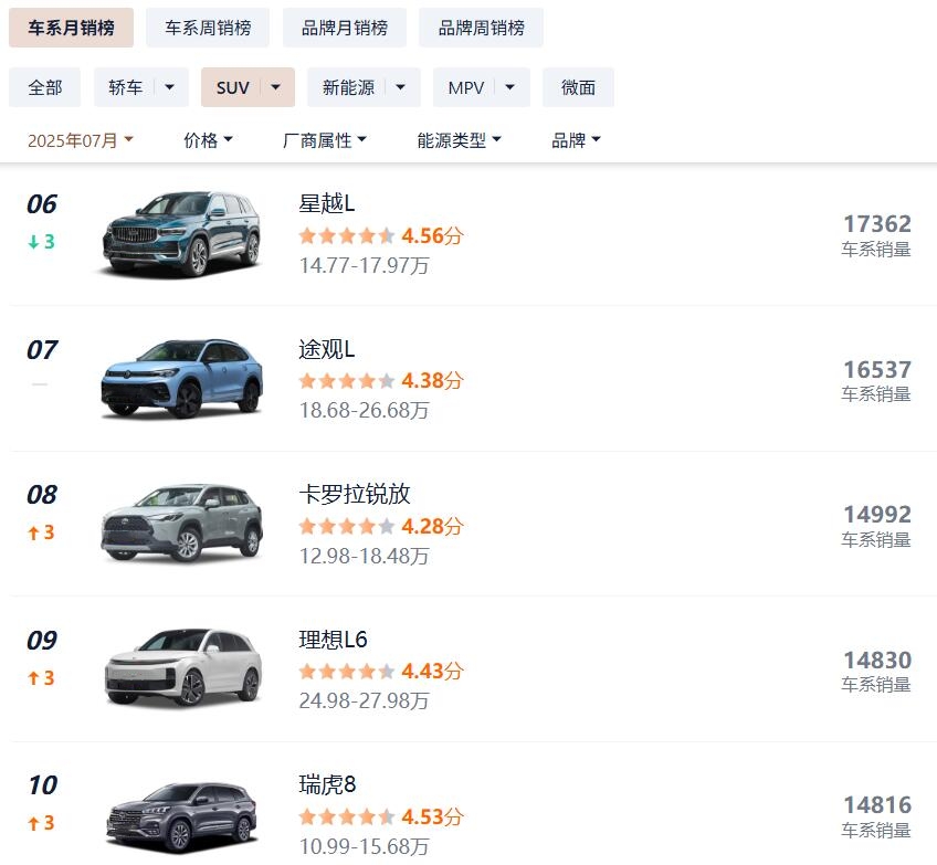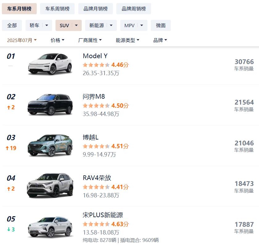 第7名是大众途观L,它的销量为16537台,它也是大众旗下唯一上榜的车型。这6款燃油车型已经站好了队伍,3款是国产车型,3款是合资车型。而4款新能源汽车中,3款是国产车型,1款是美系车型。整体来看,榜单前10名中,国产车型占据了6个位置,合资车型占据了3个位置,只有特斯拉Model Y是美系独资车型。最后,对于7月份SUV销量排行榜的前10名,您有什么看法?