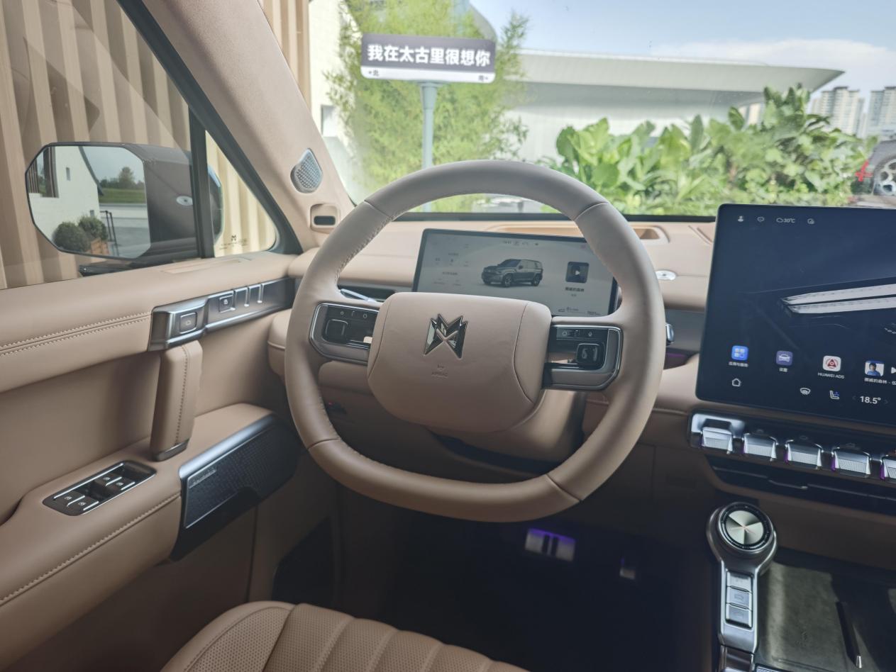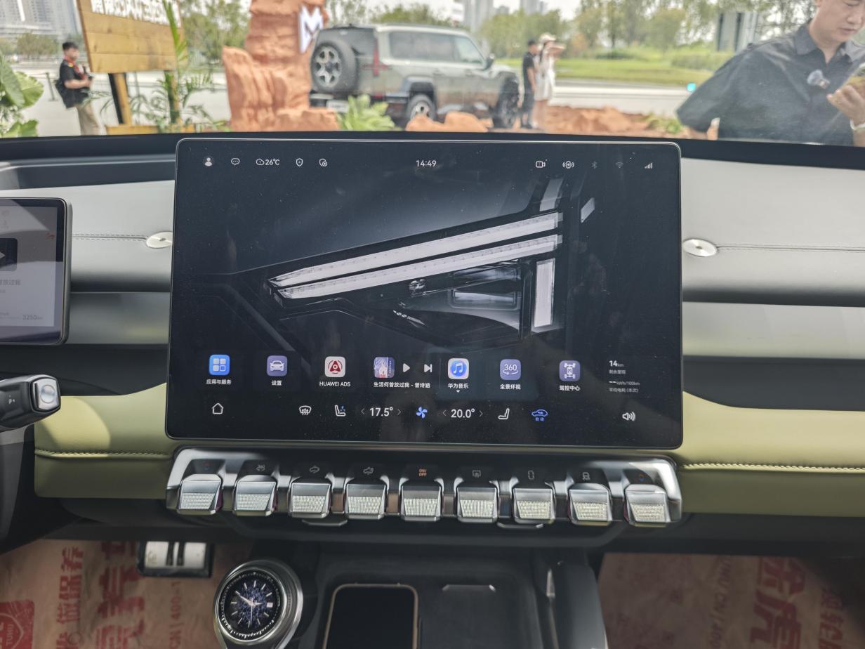 相比起凌厉的外观造型,内饰则表现得比较低调,线条四平八稳,整体采用了时下流行的简约科技风的风格,该车采用了怀档的设计,中控位置更简洁,中控大屏下方设有一排物理按键,方便驾乘人员操作。猛士M817配备有悬浮式10.25英寸液晶仪表盘和15.6英寸中控屏,车机系统应用鸿蒙座舱HarmonySpace 5。