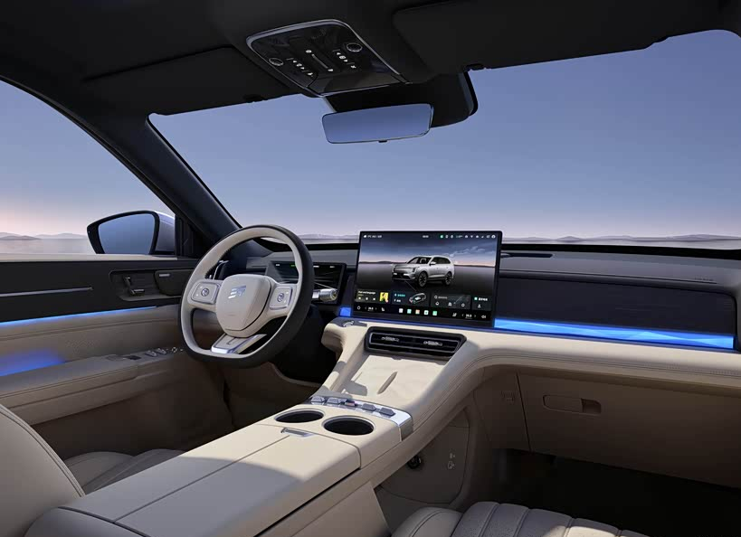进入车内的第一感受,是一种温馨的家用氛围。身体接触到的地方基本都是软质包覆,减少长时间乘坐的疲劳感。浅色木纹饰板配合温和的内饰色调,不会有科技车那种冷冰冰的感觉。中控和功能区设计比较规整,没有为了“科技感”而牺牲操作便利性。在智能化方面,它有两个小亮点。中控屏可自动左右偏转10°,谁发出语音指令屏幕就朝谁转。驾驶员看导航、调节功能更顺手。导航实用性高,能规划路线,自动标注沿途的加油站、充电站,长途自驾的时候,这比到处找地方方便多了。它配了12个扬声器+7.1声道系统,虽然不是顶级发烧配置,但对大多数人来说,听歌、听广播、听有声书的效果已经足够了。
