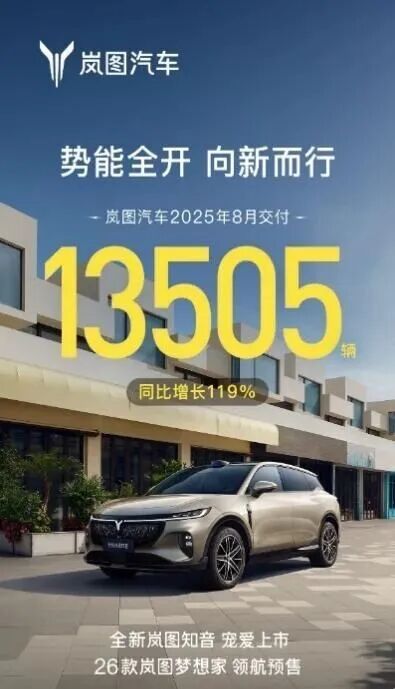2025年8月,岚图汽车交付新车13505辆,同比增长119%,实现连续第七个单月交付增长,创下品牌单月交付历史新高。今年1至8月,岚图累计交付量达81768辆,同比增长92%,成为增速最快的高端新能源品牌之一。
