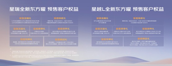 本次预售车型包括星瑞全新东方曜和星越L全新东方曜两大系列。星瑞全新东方曜提供2.0TD+8AT与1.5TD+7DCT两种动力组合,共计六个版本,官方预售价格区间为9.97万元至13.87万元。星越L全新东方曜推出三款2.0TD+8AT车型,官方预售价格区间为15.97万元至17.97万元。同时,星越L产品线仍保留行云版(15.67万元)与长风版(14.77万元),为消费者提供更加丰富的产品选择。