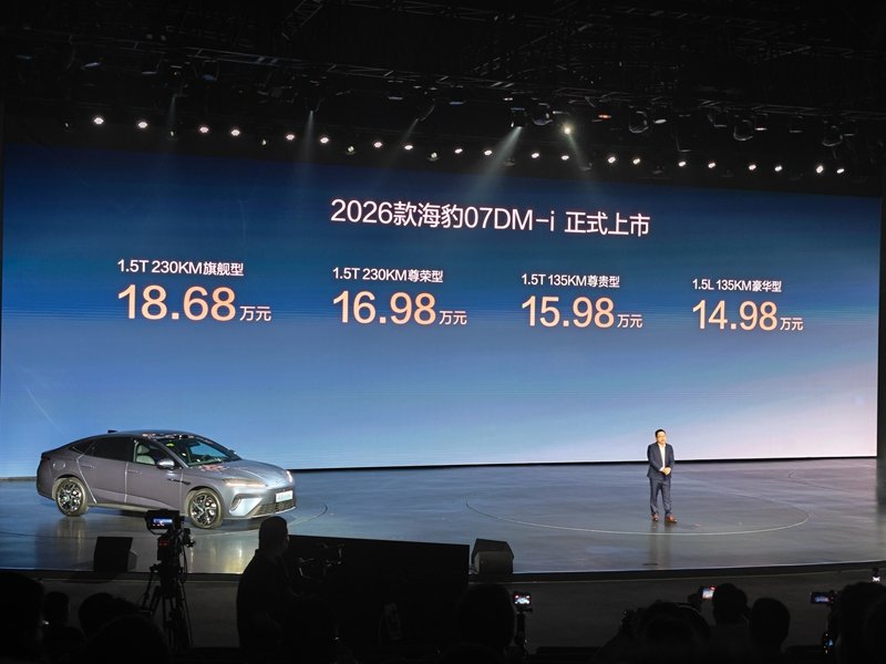 9月15日,2026款海豹07DM-i正式上市,新车共推出4个配置版本,官方指导价格为14.98万元-18.68万元。2026款海豹07DM-i在“智能、舒适、性能、颜值、安全”五大维度全面进阶,基于全新一代插混整车平台打造,新增云辇-C 智能阻尼车身控制系统、TSC高速爆胎稳定控制系统及天神之眼 B - 辅助驾驶激光版(DiPilot 300)等硬核黑科技。