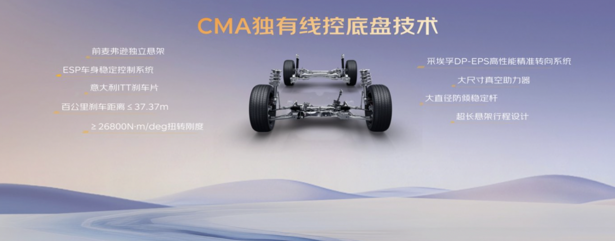 除了动力,全新东方曜系列在底盘系统上同样进行了精心的调校。系列车型采用 CMA 线控底盘技术,前后配重比接近 50:50 的完美配重,这种均衡的配重让车辆在行驶过程中更加稳定,转向精准度也大幅提升。同时,车辆配备四轮独立悬架、运动负外倾角设计、大直径防倾稳定杆等豪华装备,进一步优化底盘性能,减少车身侧倾,大大提升操控稳定性与舒适性。