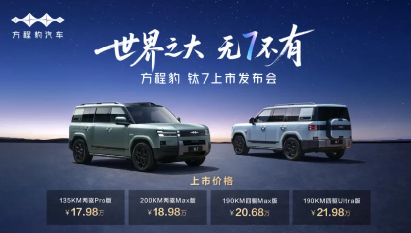 【陕西购车网讯】9月9日,比亚迪最新开创之作“大五座天花板”——方程豹钛7正式上市,新车共推出4个配置版本,售价17.98万元-21.98万元:其中,135KM两驱Pro版17.98万元,200KM两驱Max版18.98万元,190KM四驱Max版20.68万元,190KM四驱Ultra版21.98万元,款款越级,款款超值,下单即刻享受最高价值超3.6万元的上市权益。