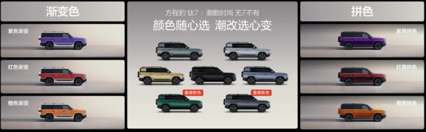 为了让广大用户选得尽兴,钛7直接一步到位,带来了7款外观颜色、3款内饰颜色,同步在官方商城上架了6款潮改方案,可满足不同用户的审美偏好,真正实现了个性平权。