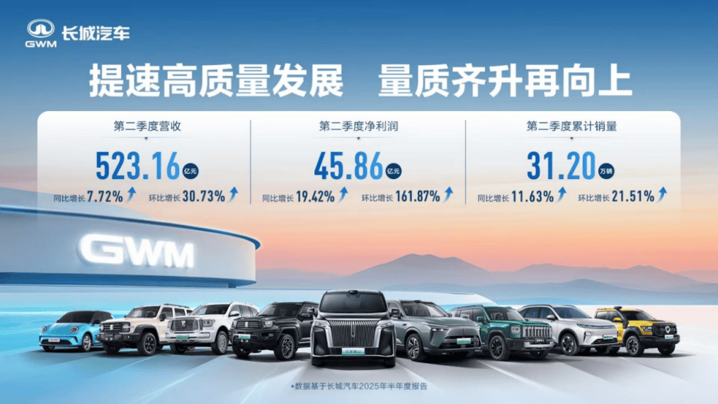 更值得关注的是,2025二季度的归母净利润回暖至45.9亿元,同比大幅上升19.1%,环比激增161.9%。这表明长城汽车不仅销量增长,经营质量也在提升。
