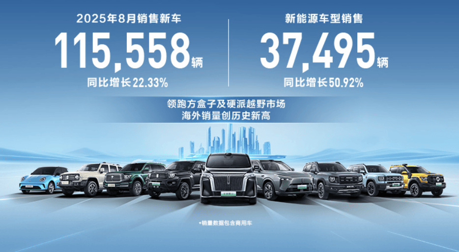 日前,长城汽车发布2025年8月销量成绩单。数据显示,长城汽车8月销售新车11.56万辆,同比增长22.33%,创下历史最佳8月销量表现,1~8月,长城汽车共计销售新车78.97万辆,同比增长5.94%,反映出其产品竞争力和市场适应性。