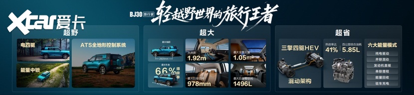 即便是轻越野旅行SUV,也需要足够专业的越野能力。BJ30旅行家要做越野能力最强的轻越野旅行SUV,搭载超级混动系统,拥有同级最大的301kW综合功率和同级最大的685N•m综合扭矩;搭载电四驱系统,响应速度仅需0.03秒,是机械四驱的3倍以上;搭载极速模式,零百加速仅需6.59秒;配备“能量中锁”和“四轮电子限滑”功能,能自动识别打滑车轮并将动力瞬间转移至有附着力的车轮,实现轻松脱困;拥有ATS全地形控制系统,提供雪地、沙地、泥地、涉水等7种驾驶模式,应对旅行之中的复杂路况。BJ30旅行家通过更高维度的技术标准来打破轻越野市场。可以说,这是对行业现有产品的“降维打击”。